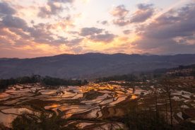 梯田景色壮观美丽,特别是日出之际,眼前水面上不断变化的颜色让人目不暇接。多依树主要是拍日出,由于天不亮,在海拔2000多米的元阳梯田的景观台上,远处的天边渐渐泛起了橘红色的朝霞,梯田的轮廓也渐渐显露出来,天空呈现紫红色,映在梯田的水面呈现出深紫色。