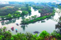 前往月亮湾,乘坐竹筏游览,它依山伴水,水面平静如镜,如月亮般弯弯的小岛,两岸的徽派民居,与周边的景色交相辉映,形成了一幅绝美的画卷。春日景区内有大片花海,五彩斑斓。泛舟水上,沿江岸巡行,江边老树探身向水,已见稀疏的枝叶经秋仍带翠色,背透阳光,明暗随着船行而变幻,非常惬意悠闲。