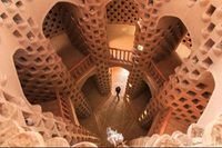 莫克清真寺因为其外墙彩釉色彩中以粉红色最为出彩,所以被人们称作粉红清真寺,这座清真寺建于1876年,至今保存完好,为设拉子必游景点。寺内的祈祷厅中间有十多根斜蛇纹柱子撑起整个大厅,每根柱子上都有雕刻以及复杂的瓷砖图案。唯一不同的是,这里地上铺着精美的波斯地毯,阳光射入进来直接洒在地毯上,色彩和线条完美的结合,置身其中犹如在万花筒之中一般。