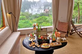 在德天跨国瀑布景区内,有一间专属的VIP观瀑景苑,该景苑坐拥观赏瀑布的最佳C位视角,在品尝下午茶的同时,感受激荡起伏的德天跨国瀑布。【图片仅供参考】