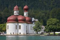 圣巴多罗买礼拜堂是国王湖的标志,坐落在国王湖中段西岸的Hirschau半岛,只能乘船或长途跋涉才能到达。这座教堂教堂起源于12世纪,自16世纪起成为巴洛克风格,小而别致,以其特别造型而出名,红色圆穹顶呈洋葱型,礼拜堂半圆形后殿分成对称的三瓣,平面图仿造了萨尔茨堡主教座堂,其粉刷由萨尔茨堡艺术家约瑟夫·施密特完成,后殿的祭台分别供奉圣巴多买、圣凯瑟琳和圣雅各。