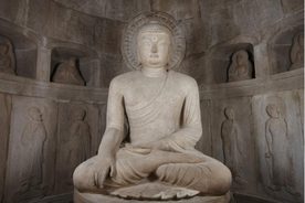 石窟庵作为韩国第24号国宝,始建于新罗景德王10年,由当时的宰相金大城主持修建。从佛国寺沿山路走3Km,再沿公路走9km便可到达。石窟庵由方形和圆形、直线和曲线、平面和球面等造型各异的岩壁佛像雕塑34尊组成,每尊佛像都堪称是一部杰作,融汇了哲学与科学两种思想。其中,位于正中央,由白色花岗岩打造而成的如来本尊坐像俯视着东海。 石窟庵1995年被联合国教科文组织指定为世界文化遗产。主室呈圆形,内有本尊像等菩萨及其弟子雕像。石窟庵正是为了供奉本尊像而建造的。本尊像坐在莲花宝座之上,姿态文雅,表情慈祥。石窟庵的屋顶呈半月形或弓形,上有莲花纹的圆盘为盖。这里日出的景色十分美丽,因此有许多游客都在清晨前往石窟庵。